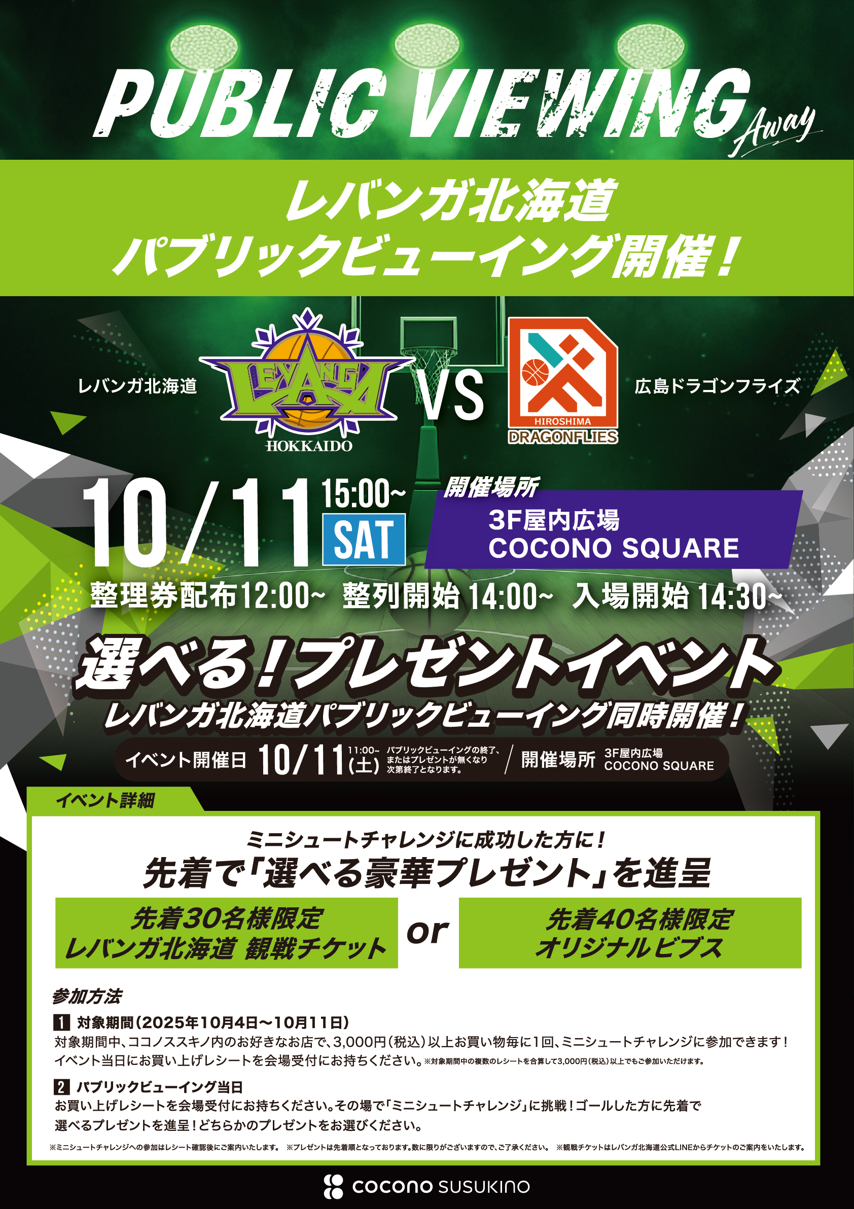ミニシュートチャレンジに成功した方には、先着で「レバンガ北海道 ホーム戦観戦チケット」または「COCONO SUSUKINOコラボ オリジナルビブス」をプレゼント。