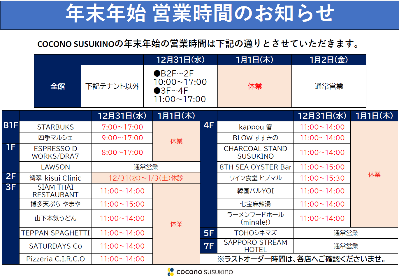 COCONO SUSUKINOは、年末年始の営業時間を添付の通りとさせていただきます。
