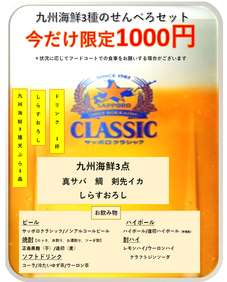 更新日:2025.12.21 3F / 博多天ぷら やまや 電話番号 011-596-9951 【新しくなり再復活!!】 せんべろセット 12月120日からスタート せんベロセット 内容は お好きなドリンク1杯と 小鉢 しらすおろし 九州の海鮮天ぷら3品で(真サバ、鯛、剣先イカ) 1,000円 昼のみ、0次会、お仕事終わりに是非ご利用お待ちしております。 3階ココノフードホールでもお食事できます。 その他定食や盛り合わせ、単品 テイクアウトもご用意しております。 お客様のご来店を心よりお待ちしております