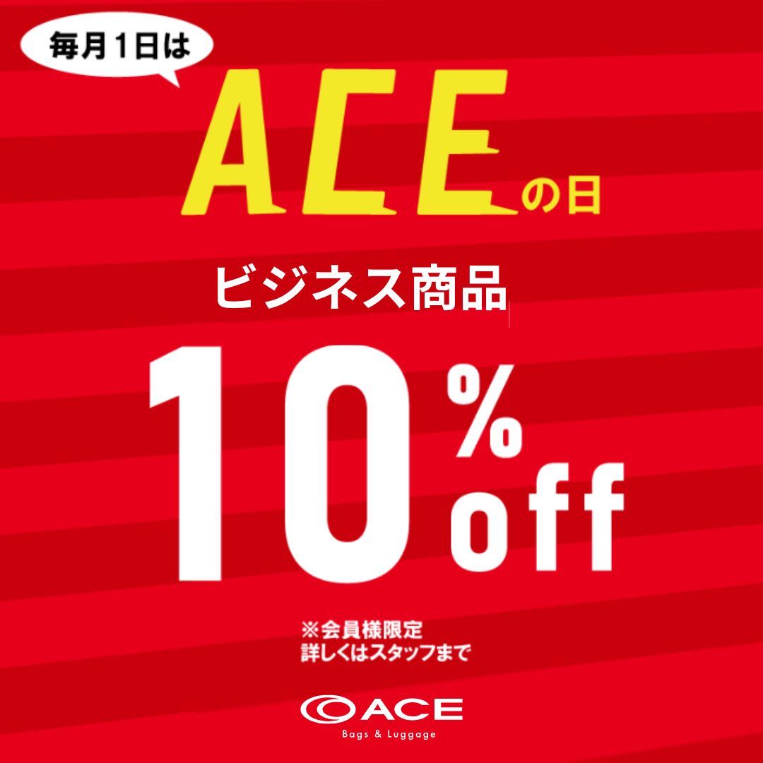 NEW 更新日:2025.10.30 2F / ACE Bags & Luggage 電話番号 011-215-1988 1日限定 ACEの日開催❢ 実施日時 11/1(土) 1日限定のACEの日 11月も開催します 今回は、ビジネスバッグ10%OFF 雪の季節に備えて 撥水加工が施されたバッグを 新調しませんか? 1日限りのセールです。 お見逃しなく