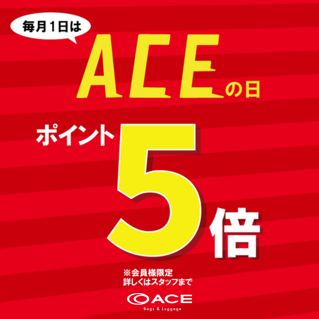 NEW 更新日:2025.11.28 2F / ACE Bags & Luggage 電話番号 011-215-1988 1日限定 ACEの日開催❢ 実施日時 12/1(月) 今年最後のACEの日は、ポイント5倍を実施いたします 日頃のご愛顧に感謝して、 通常2%のポイントを10%で還元いたします。 貯まったポイントは全国のACE直営店でご利用いただけます。 ぜひお得なこの機会をご利用くださいませ。 皆様のお越しをお待ちしております。