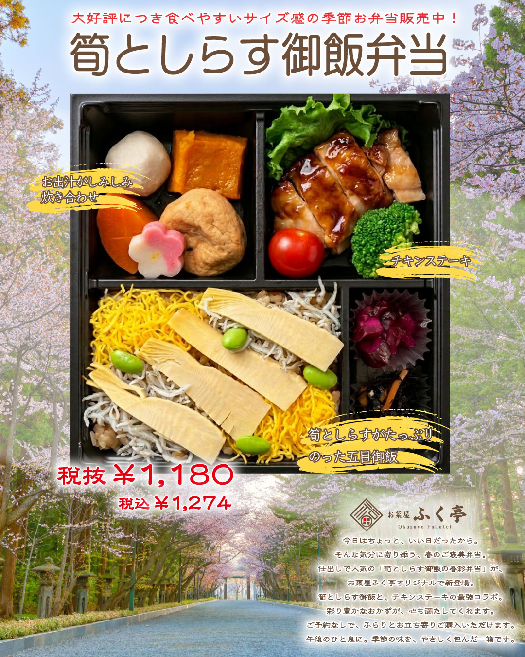 NEW 更新日:2026.03.19 B1F / お菜屋 ふく亭 電話番号 011-522-6571 ~月替わり弁当~ 月替わり弁当が新しくなりました 今月は『筍としらす御飯弁当』 仕出しふく亭でも大人気の弁当! 食べやすいサイズ感になって店頭でも販売!! 他のお弁当より華やかなお弁当です! 会議や食事会にもおすすめの商品です 皆様のご来店お待ちしております(⁎ᴗ͈ˬᴗ͈⁎) 仕出しふく亭